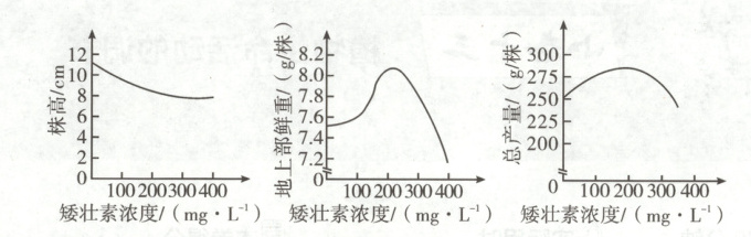 12. [2024·贵州卷,9T,3分]矮壮素可使草莓植株矮化,提高草莓的产量。科研人员探究了不同浓度的矮壮素对草莓幼苗的矮化和地上部鲜重,以及对果实总产量的影响,实验结果如图所示。