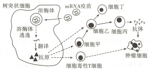 (2)溶酶体中含有多种水解酶,如果mRNA被溶酶体中的水解酶降解,就无法发挥编码肿瘤抗原的作用。故“溶酶体逃逸”可以避免mRNA被溶酶体中的水解酶降解并释放出来,从而能够正常翻译出肿瘤抗原。