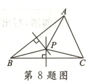 8. 如图,三角形三条边的垂直平分线相交于一点$P$,则以下结论正确的是 (