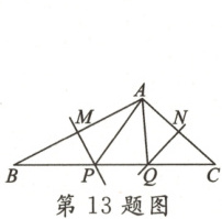 13. 如图,在$\triangle ABC$中,$\angle BAC = 108°$,$PM$和$QN$分别是$AB$和$AC$的垂直平分线,则$\angle PAQ =$