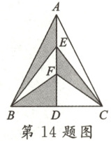 14. 如图,$AD$所在直线是$\triangle ABC$的对称轴,点$E,F$是$AD$上的两点.若$BD = 3$,$AD = 6$,则图中阴影部分的面积是