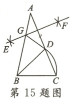 15. 如图,在$\triangle ABC$中,$AB = 5$,$BC = 3$,以点$B$为圆心,$BC$的长为半径画弧,与$AC$相交于点$D$,再分别以点$A,D$为圆心,大于$\frac{1}{2}AD$的长为半径画弧,两弧相交于点$E,F$,作直线$EF$,交$AB$于点$G$,连接$DG$,则$\triangle BDG$的周长为