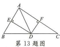 13. 如图,在$\triangle ABC$中,$AD$为中线,$DE$和$DF$分别为$\triangle ADB$和$\triangle ADC$的高. 若$AB = 6$,$AC = 8$,$DF = 3$,则$DE =$