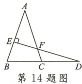 14. 如图,点$D$在$BC$的延长线上,$DE \perp AB$于点$E$. 若$\angle A = 30^{\circ}$,$\angle D = 20^{\circ}$,则$\angle ACB$的度数是