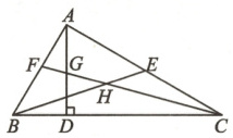 10. 如图,在△ABC中,∠BAC=90°,AD是高,BE是中线,CF是角平分线,CF交AD于点G,交BE于点H,现给出以下结论: