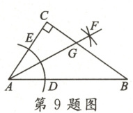 9. 如图,在$Rt \bigtriangleup ABC$中,$\angle C = 90^{\circ}$,以点$A$为圆心,适当长为半径作弧,分别交$AB$,$AC$于点$D$,$E$,再分别以点$D$,$E$为圆心,大于$\frac{1}{2}DE$的长为半径作弧,两弧相交于点$F$,作射线$AF$交$BC$于点$G$.若$AB$=12,$CG$=3,则$\bigtriangleup ABG$的面积是