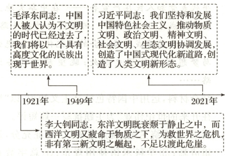 23.D 从时间轴和李大钊同志、毛泽东同志、习近平同志的话可以看出,中国共产党是带领中国人民创造人类文明新形态的核心力量,③正确。人类文明新形态内生于中国式现代化道路,是中国特色社会主义在实践探索中形成的物质文明、政治文明、精神文明、社会文明、生态文明整体协调和全面发展的文明形态,是坚持和发展中国特色社会主义的实践成果,④正确。第三新文明的设想为推动人类文明繁荣发展贡献了智慧,而不是最佳道路,①错误。共性寓于个性之中,并通过个性表现出来,人类社会发展的一般进程是由各国历史的多样性反映出来的,②错误。