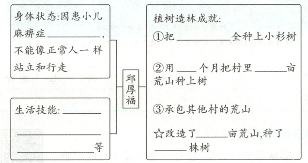 1.(新题型)邱厚福虽身有残疾,但却作出了一番成就。请将思维导图补充完整。(5分)