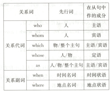 关系代词有 as, which, who, whom, whose 等,作定语从句的主语、宾语、表语或定语。当先行词指人时,通常使用 who, whom, whose 来引导;当先行词指物时,通常使用 which, whose 来引导。关系代词不可以省略。另外,that 不能引导非限制性定语从句。