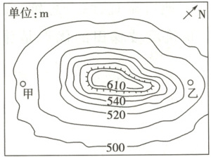 (2)题,根据等高线数值分析,可知陡崖为5条等高线重叠,等高距为10m,故陡崖的相对高度可能是50m。第