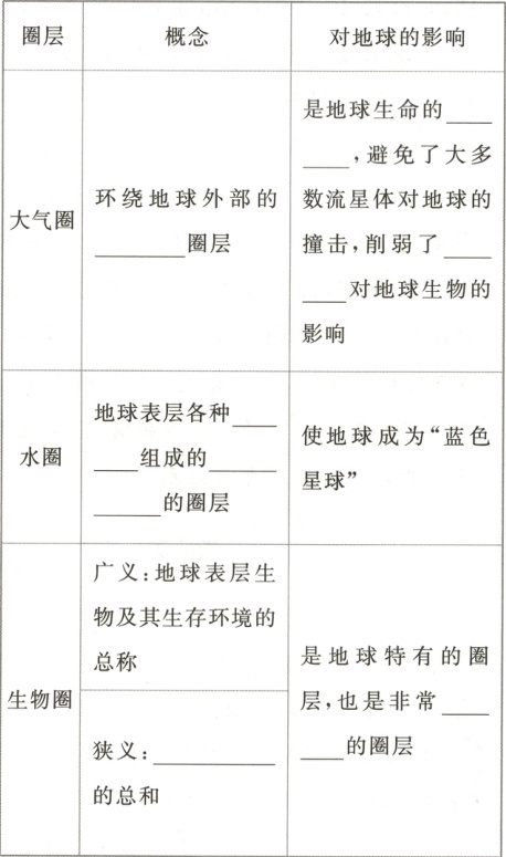 二、1.大气 水 生物 2.气体 保护伞 紫外线 水体 连续但不规则 地球表层生物 活跃