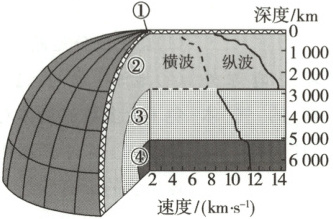 (2)题,据图可知,横波在①处传播速度较慢;②地幔内部物质组成不均;③外核呈液态或熔融状态,因此横波无法通过;④内核由铁和镍组成。]