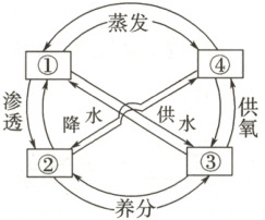 (1)题,图中①向③供水,同时又能向②进行渗透,说明是水圈;③需要供水,且能提供氧气,则是生物圈;④能降水,说明是大气圈;②接受降水和渗透,是岩石圈。第