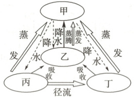 下图为水循环联系四大圈层示意图。读图,完成5~6题。