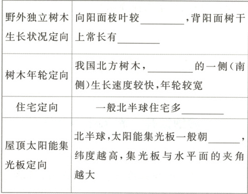 四、南 北 茂盛 苔藓 向阳 坐北朝南 南 微思考:提示:冬暖式大棚的坡面一般向阳;屋顶太阳能集光板一般朝向正午的太阳。