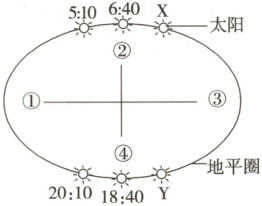 1.C 2.B [第1题,太阳东升西落,由材料可知,②表示正东,④表示正西,北半球夏至日我国日出东北、日落西北,则③表示正南,①表示正北。第2题,根据上东下西,左北右南的方位可知,X日出东南,Y日落西南,太阳直射南半球,为冬至日日出、日落。相反5:10日出,20:10日落为夏至日日出、日落,夏至日该地昼长为15小时,所以冬至日该地夜长为15小时,冬至日该地日出时地方时为7:30,日落时地方时为16:30,从二分日该地日出地方时为6:00而北京时间为6:40可知,当地地方时比北京时间晚40分钟,所以该地地方时为7:30时,北京时间是8:10,该地地方时为16:30时,北京时间是17:10。所以X、Y表示的时间分别是8:10和17:10,B正确。]