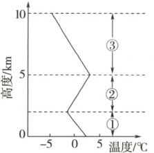 3.A 4.B 5.B [第3题,该图示意的大气垂直分层高度只有10km,属于对流层。第4题,②层气温随海拔升高而升高,出现逆温现象,该层大气以水平运动为主。第5题,由于①层上部为逆温层,抑制了近地面空气对流上升,导致污染物含量较高。]