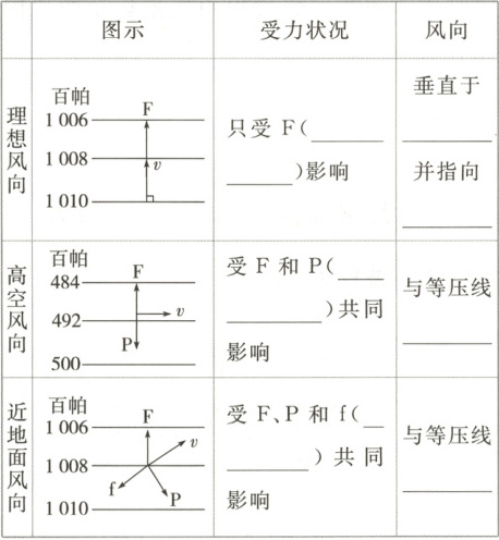 4.× 在高空,风基本不受地面摩擦力的影响,风向主要取决于水平气压梯度力和地转偏向力。在以上两个力的共同作用下,风向逐渐偏离水平气压梯度的方向,在北半球向右偏转,最终可偏转至平行于等压线。