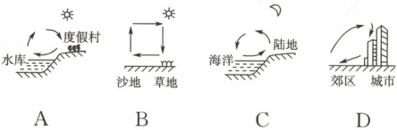 (2)题,结合热力环流的形成原理可知,白天近地面风应该由水库吹向度假村,A图不符合题意;白天近地面风由草地吹向沙地,B图符合题意;夜晚风由陆地吹向海洋,C图不符合题意;城市气温高,盛行上升气流,郊区气温低,盛行下沉气流,D图不符合题意。]