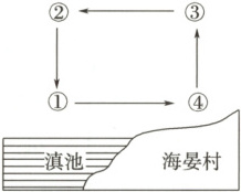 1.A 2.B [第1题,图中①④位于近地面,②③位于高空,受海拔差异的影响,①④的气压整体高于②③,B、C错误。①④位于同一水平面,风向由①吹向④,可判断①气压高于④,A正确,D错误。第2题,图示时刻,风由滇池吹向海晏村,由于海晏村位于滇池东岸,水平气压梯度力应由西向东,受地转偏向力向右偏转的影响,风向应为西北风,B正确,A、C、D错误。]