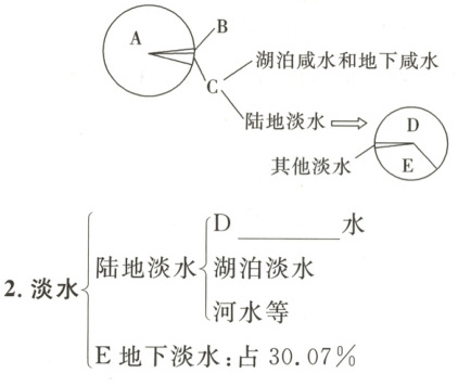 提示:1.× 目前,人类可直接利用的淡水资源主要是河水、淡水湖泊水和浅层地下水,占水体的比重很小。