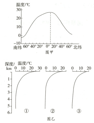 海水温度是反映海水冷热状况的一个物理量,其大小主要取决于海水热量的收入和支出状况。其中,海水热量收入主要来自太阳辐射,海水热量支出主要指海水蒸发所消耗的热量。世界海洋热量的收入和支出基本上是平衡的,但在不同季节、不同海区,热量收支不平衡。图甲是海洋表层平均温度随纬度的变化图,图乙是太平洋170°W附近三个观测站水温随深度变化的曲线图。
