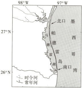2. 马德雷湖位于墨西哥湾沿岸(下图),水体较浅,湖水盐度通常维持在50‰以上。据此完成(1)~(2)题。