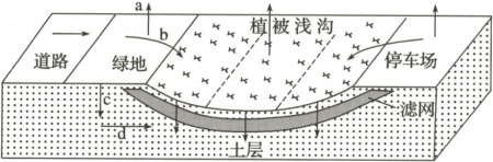 (1)题,读图分析可知,图中的a为蒸发,b是地表径流,c是下渗,d是地下径流。在城市建设中用植被浅沟代替不透水的硬质地面会使水循环环节中的c下渗增加,b地表径流减少,d地下径流增加,a蒸发增加。