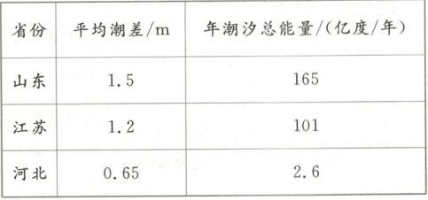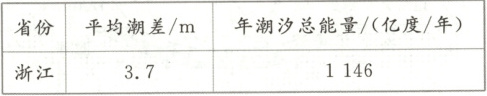 1.A 2.C [第1题,根据表格中数据可知,中国近海的潮差分布特点是黄海潮差小,东海潮差大;表中是平均潮差,不能表示潮差的季节变化;表中数据都是近岸潮差;位于沿海地区,与左岸、右岸无关。第2题,浙江省海岸线曲折,潮汐资源丰富;受夏季风影响,增强了潮汐的能量;海底较深,海水运动的阻力小。潮汐能是天体引潮力形成的,与地转偏向力无关。]