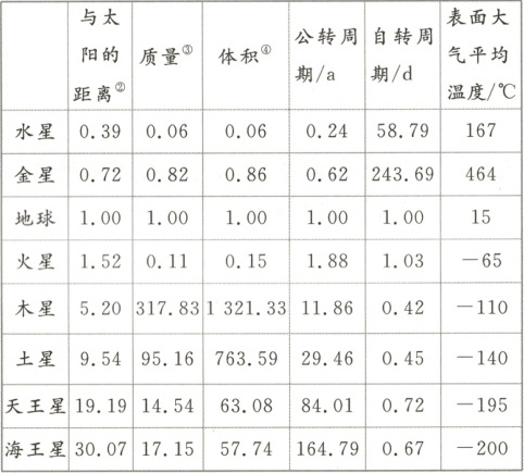 问题1 提示:从表中可以看出,地球的质量、体积、平均密度与其他行星相比,特别是与类地行星相比没有特别之处;地球的公转周期、自转周期与其他行星相比也并不特殊,所以地球是太阳系中的一颗普通行星。