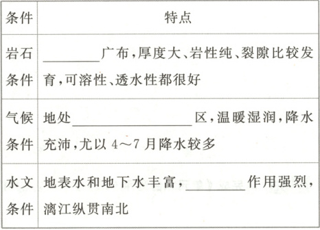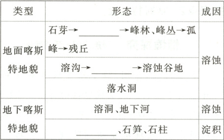(2)可溶 透水 溶蚀 流动 3.石灰岩 亚热带季风气候 流水侵蚀 有机酸