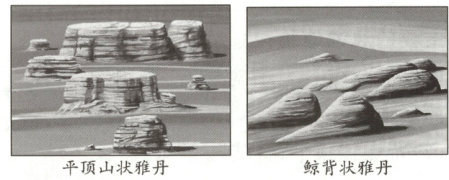 雅丹地貌,现泛指干旱地区一种风蚀地貌,河湖相土状沉积物所形成的地面,经风化作用、间歇性流水冲刷和风蚀作用,形成与盛行风向平行、相间排列的风蚀土墩和风蚀凹地(沟槽)地貌组合。下图为两种常见的雅丹地貌示意图。