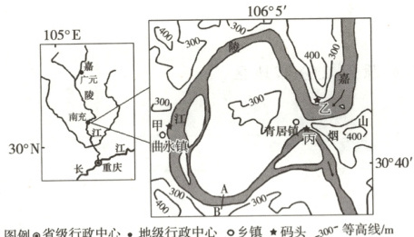 材料一 2024年7月,去四川南充研学旅行的某高中学生发现嘉陵江在这里形成了一个$359°$的巨大曲流,滩险流急,河曲深嵌峡谷之中。青居曲流是嘉陵江嵌入式河曲的典型代表,被称为“天下第一曲流”。
