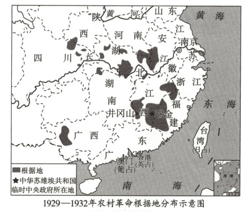 5. C [题干图片显示了1929—1932年中国共产党建立的农村革命根据地分布情况,根据图片内容可知,当时农村革命根据地多分布在长江以南地区,特别是湖南、湖北、江西、海南等省份,这主要是因为国民革命主要发生在南方,中国共产党及其领导下的革命力量在这些省份的力量比较强,由此得出农村革命根据地的分布与国民革命运动密切相关,故选C项;俄国革命模式是城市中心,建立农村革命根据地是对农村中心的革命道路的探索,与俄国革命模式不同,排除A项;农村革命根据地主要分布在各省交界地带的农村和山地,长江沿岸交通要道敌人力量强大,并非农村革命根据地的集中分布地点,排除B项;D项材料体现不出,排除。]
