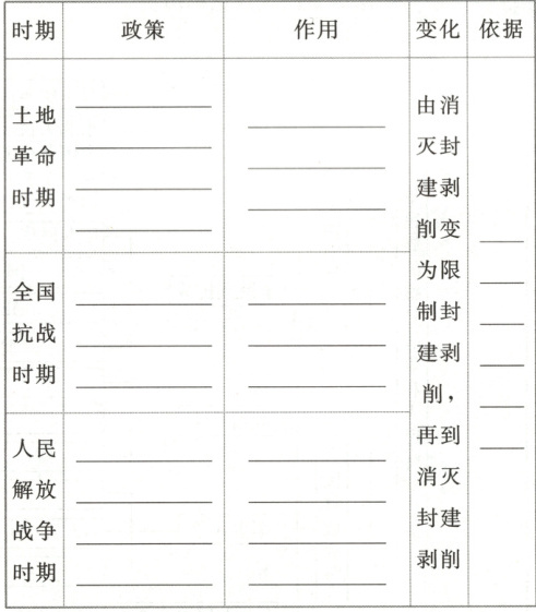 打土豪、分田地,废除封建剥削和债务,开展土地革命 农民在经济上和政治上翻了身,农民积极参军参战,发展生产 地主减租减息、农民交租交息 有利于团结农民、地主一致抗日 废除封建性及半封建性剥削制度 解放区农民获得了土地,激发了农民革命和生产的积极性 社会主要矛盾和革命首要任务的变化
