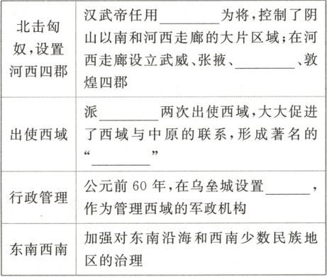 1.提示:采取“与民休息”政策。出现“文景之治”的盛世局面。 2.提示:主张“大一统”,统一思想以巩固国家的统一局面。 3.提示:设西域都护府和河西四郡,加强对西北地区的统治。