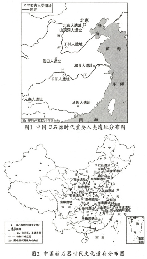 思考:图 2 与图 1 相比,我国文化遗址在分布上发生了什么变化?结合史料二分析发生这一变化的主要原因。