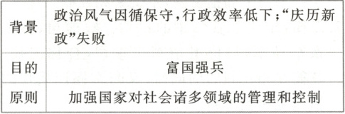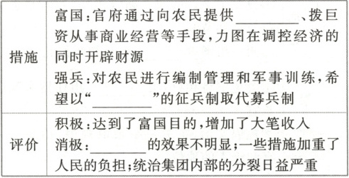必备知识:富国措施为官府向农民提供农业贷款;强兵措施是以“兵农合一”的征兵制取代募兵制;评价消极方面是强兵效果不明显。即:农业贷款 兵农合一 强兵
