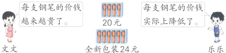 再算全新包装每支钢笔的价钱:24元买了6支,所以24÷6=4(元)。