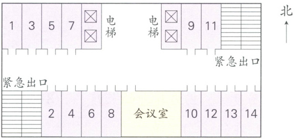 2 阳光小学举行了安全疏散演练活动。下面是二年级14个班所在教学楼的紧急疏散示意图。(紧急疏散时不乘电梯,师生要前往最近的紧急出口)