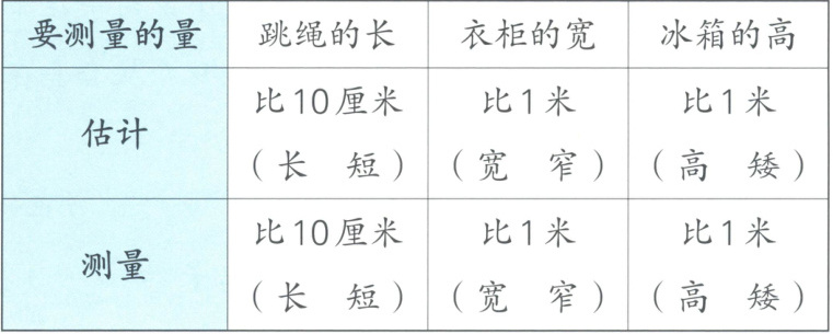 | 要测量的量 | 跳绳的长 | 衣柜的宽 | 冰箱的高 |