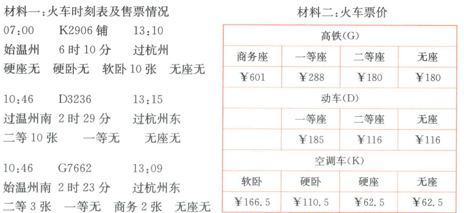 (2) 从省时、舒适、经济的角度,小刘应选的车次是(