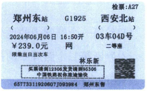 3.(河南省郑州市真题)林乐新要将自己去西安大唐不夜城游玩时买的车票收藏起来,却发现车票上的信息显示不全了,请你帮他补一补。