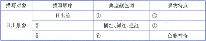 1. 作者是按照怎样的顺序来描写日出景象的?运用了哪些描写颜色的词语?表现了景物怎样的特点?根据选文内容,完成下面的表格。