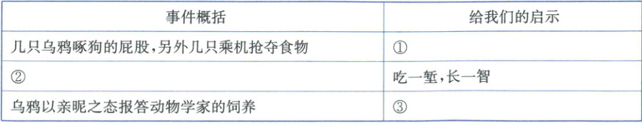 (6)仔细阅读短文,你会发现乌鸦的某些举动能给我们带来一定的启示。请根据短文内容,将下表补充完整。