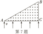 7.C 解析:当粒子运动轨迹与$A、B$边相切于$D$点,右边刚好从$C$点射出,此时对应的磁感应强度有最大值,粒子运动轨迹如图所示,根据几何关系有$\sqrt{3}L = r + \frac{r}{\sin 30°}$,解得$r = \frac{\sqrt{3}}{3}L$,根据洛伦兹力提供向心力有$qvB = m\frac{v^2}{r}$,联立解得$B = \frac{\sqrt{3}mv}{qL}$,选项C正确。