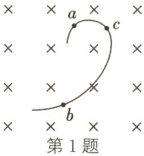 1.B 解析:根据牛顿第二定律有$qvB = m\frac{v^2}{r}$,解得$r = \frac{mv}{Bq}$,由题意可知粒子速率逐渐减小,所以轨迹半径逐渐减小,即粒子从$b$运动到$a$,根据左手定则可判断粒子带正电,选项B正确。