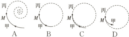 3.D 解析:由洛伦兹力提供向心力,则有$qvB = m\frac{v^2}{r}$,可得粒子轨道半径$r = \frac{mv}{qB}$。由于甲粒子在$M$点突然向与原运动相反的方向放出一个不带电的粒子乙,由动量守恒可知,放出粒子乙后,新粒子丙的动量$mv$大于粒子甲的动量,故轨道半径变大,选项D正确。