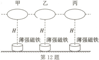 12.C 解析:乙是有缺口的铝线圈,没有构成闭合回路,线圈之中没有产生感应电流,丙是闭合的塑料线圈,属于绝缘材料,线圈之中也没有产生感应电流,可知乙、丙两线圈下落过程只受到重力作用,线圈做自由落体运动,根据$H= \frac{1}{2}gt^{2},$可知$t_{乙}=t_{丙},$甲是闭合的铝线圈,属于导体,构成闭合回路,根据楞次定律可知,线圈之中产生了感应电流,且薄强磁铁产生的磁场对线圈的安培力阻碍线圈向下运动,即线圈向下运动的加速度小于重力加速度,可知线圈下落的时间大于乙、丙线圈下落的时间,即有$t_{丙}<t_{甲},$选项C 正确。