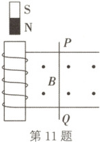 11. (2024·湖北荆门期末)如图所示,导体棒 PQ 放在垂直纸面向外的匀强磁场中,PQ 与螺线管和金属导轨组成闭合回路,将条形磁铁的 N 极迅速插入螺线管内时,关于导体棒 PQ 中的感应电流方向和 PQ 受到的安培力方向,下列说法正确的是 (